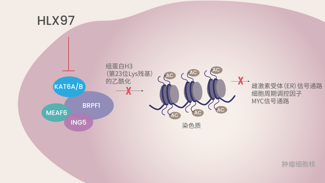HLX97 is a novel, oral KAT6A/B inhibitor with best-in-class potential. By precisely inhibiting KAT6A/B activity, HLX97 inhibits tumor cell proliferationand induces apoptosis. It is characterized by a "fast-on/fast-off" pharmacokinetic profile and high selectivity, designed to maximize anti-tumor efficacy while minimizing hematologic toxicity. Nonclinical studies have demonstrated that HLX97 exhibits potent anti-tumor activity and a favorable safety profile. In comparisons with PF-07248144, HLX97 exhibited superior enzymatic inhibition and enhanced selectivity against KAT5/7/8. Notably, in preclinical studies, HLX97 demonstrated anti-tumor activity comparable or superior to the reference molecule at lower doses. Furthermore, at similar efficacy levels, HLX97 induced significantly less hematological toxicity, suggesting a potentially broader therapeutic window in the clinical setting. Additionally, HLX97 shows favorable ADME characteristics, such as high oral bioavailability and excellent pharmacokinetics 4-5.