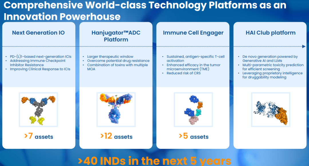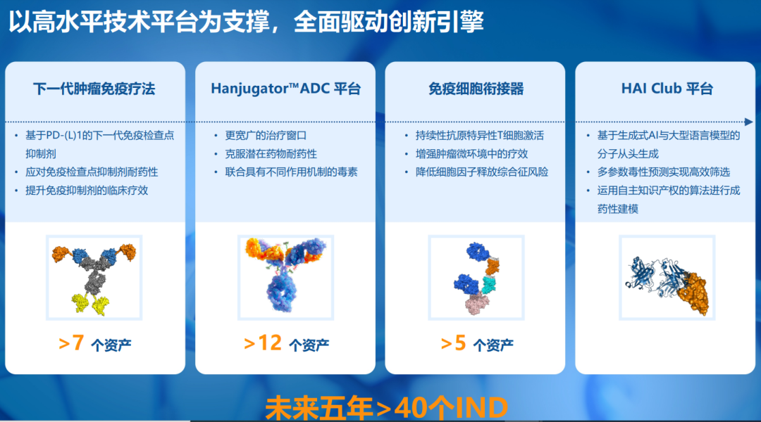 目前,从早期靶点筛选、验证,候选分子设计与优化,到系统性地临床前开发,公司已搭建起包括PD-(L)1为核心的免疫检查点抑制剂平台、免疫细胞衔接器平台(如多特异性TCE平台)、Hanjugator™ ADC 平台、AI驱动的一站式早期研发平台HAI Club在内的多维创新平台矩阵,不仅保障了单个项目的研发质量与效率,更关键的是为打造具备全球竞争力的中长期创新管线提供了可持续的系统能力支撑,从而能够持续、高效地将前沿科学发现转化为具有临床价值的候选药物。未来五年内,公司预计将有超过40项新的临床研究申请获批。