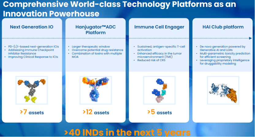 Henlius has established an integrated R&D system spanning target identification and validation, candidate design and optimization, and systematic preclinical development. This system is supported by a multi-dimensional technology platform framework, including a PD-(L)1-centred immune checkpoint inhibitor platform, immune cell engager platforms such as multi-specific T-cell engagers (TCEs), the Hanjugator™ ADC platform, and the AI-driven one-stop early discovery platform HAI Club. Together, these platforms support the efficient advancement of individual programs and contribute to the development of a differentiated and globally competitive pipeline. By enabling the translation of scientific discoveries into clinical-stage candidates, Henlius continues to advance its early-stage innovation capabilities. Looking ahead, the company expects to submit more than 40 investigational new drug (IND) applications over the next five years.