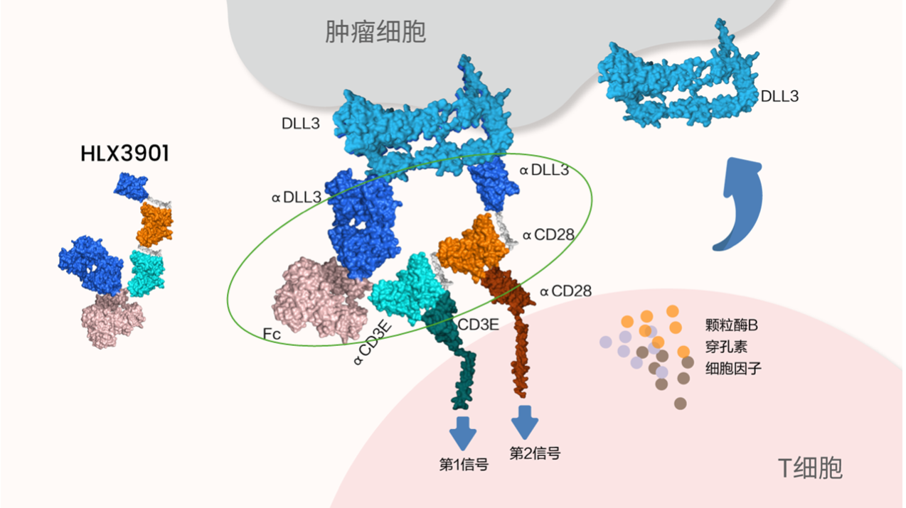 HLX3901是一款擁有自主知識產權的四特異性抗體藥物,能夠精準靶向DLL3雙表位、CD3和CD28,作為新一代T細胞銜接器,HLX3901旨在增強對腫瘤細胞的殺傷,克服免疫抑制,並優化T細胞銜接器在實體瘤中的治療窗口。其作用機制主要包括: